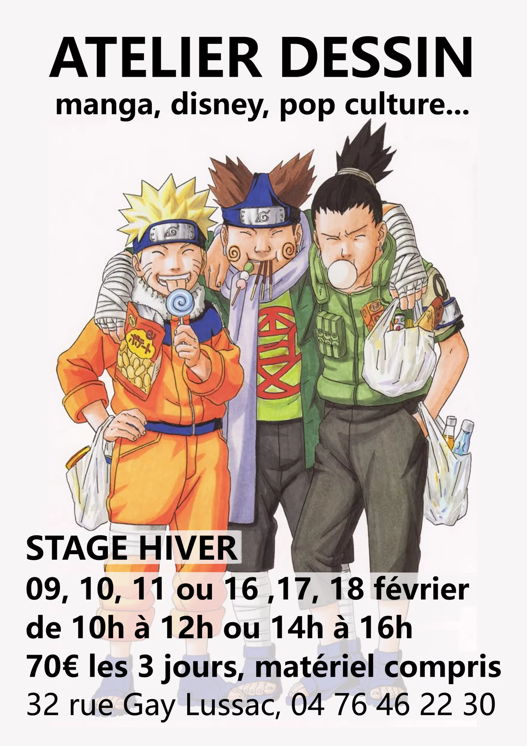 Si vous souhaitez venir de manière plus ponctuelle, ou juste découvrir les cours, chaque période vacances scolaires retrouvez nos stages de dessin sur 3 jours, 2 heures par jour, au tarif de 70€, matériel compris.
